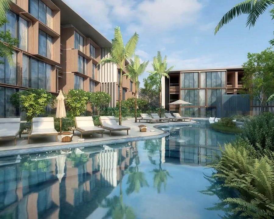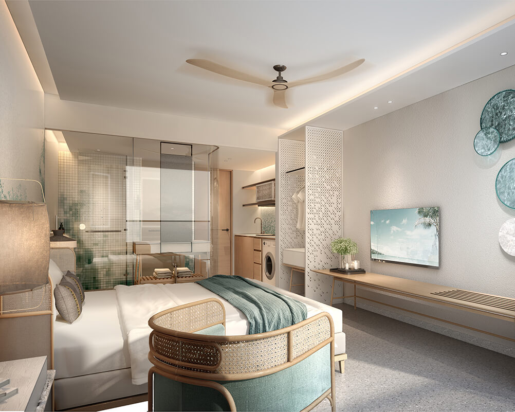 Awarded the 2019 Best Landscape Architectural Design in Phuket, Platinum Bay’s design emphasizes a harmonious blend of modern architecture with natural beauty. The resort boasts two communal pools, a waterfall garden, a sunset lounge, and multiple dining and fitness facilities. Each unit, ranging from studios to one-bedroom apartments, offers stunning views—whether of the garden, pool, or sea—and comes fully furnished with luxury fixtures and fittings.